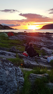 Vi satsa på leir på Kjerstadsanden, og som vanleg gjekk tida fort og kvelden kom brått. Det var godt å trø seg i land på berga ved stranda og konstatere flatt nok gras til minst tre telt! Dårleg med ved var det, men simsalabim så dukka ein av plastpiratane opp, og då ordna det seg med ein vedsekk. Små plassar og kjentfolk altså!